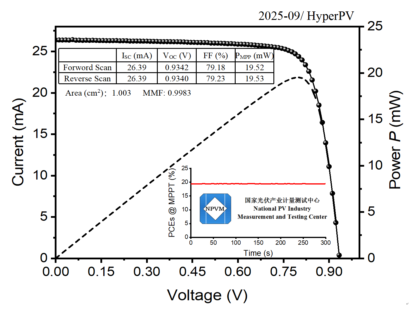 Researchers in HyperPV developed the OPV cell with ternary approach with commercially available polymer donor D18, nonfullerene acceptor L8-BO, and fullerene acceptor PC61BM. The third component PC61BM was added to improve the stability of the cell. The cell has an open-circuit voltage (VOC) of 0.934 V, a short circuit current (JSC) of 26.31 mA/cm2, and a fill factor (FF) of 79.2%. The cell maintained a stable state during the Maximum Efficiency Point Tracking Output (MPPT) test. The relative fluctuation of the output power of the OPV cell was less than 0.1% for a total test time of 5 minutes.